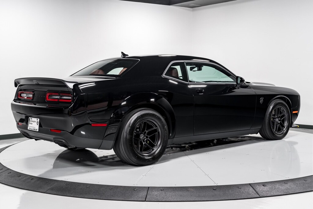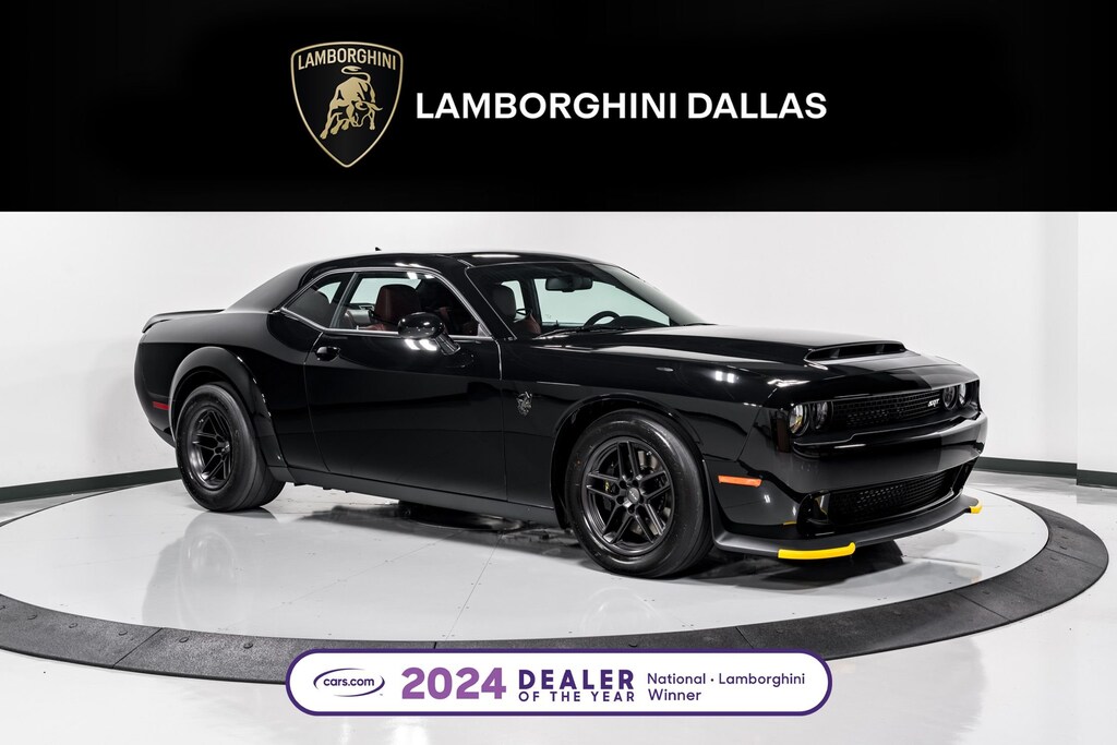 This is a smoke free Carfax certified 2023 Dodge Challenger SRT Demon 170 equipped with a 6.2L V8 Supercharged HO engine and a Torqueflite 8-speed automatic transmission. This car is an elegant Pitch Black exterior paint color and finished in a Black and Demonic Red leather interior along with Alcantara.