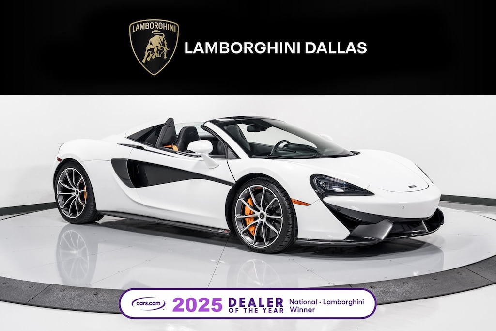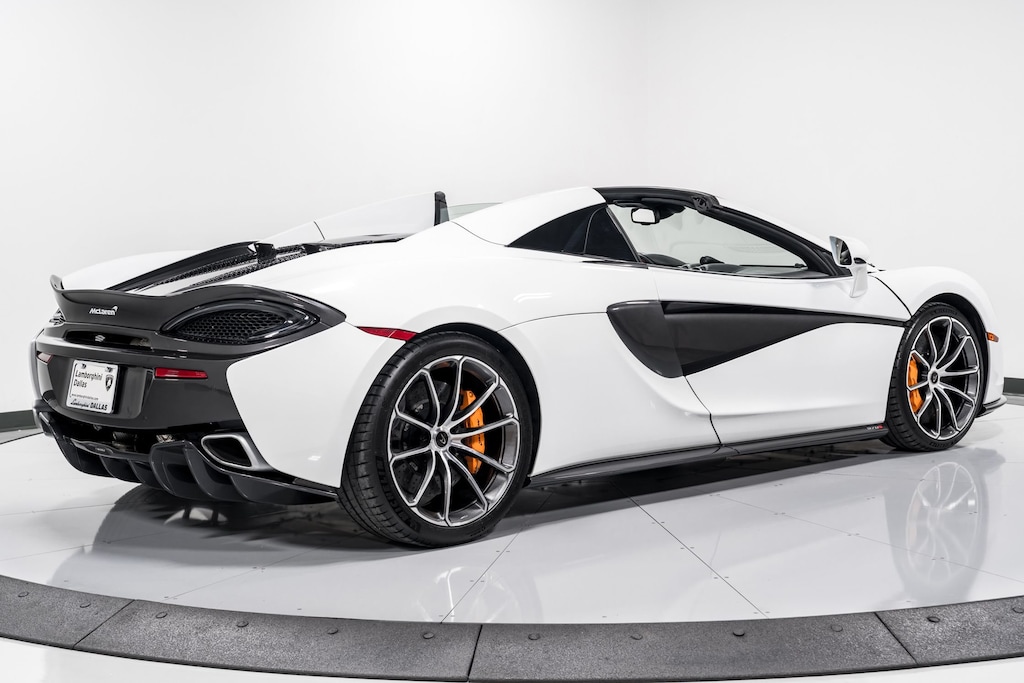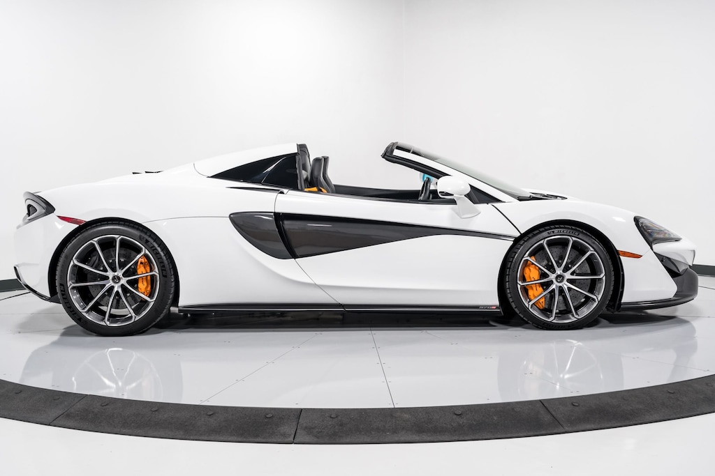 This is a smoke-free Carfax certified 2020 McLaren 570S Spider equipped with a 3.8L 562HP twin-turbo V8 engine and a 7-speed SSG dual-clutch transmission with RWD. This car is finished in a beautiful Silica White exterior paint color and Carbon Black Leather with contrast stitching.
